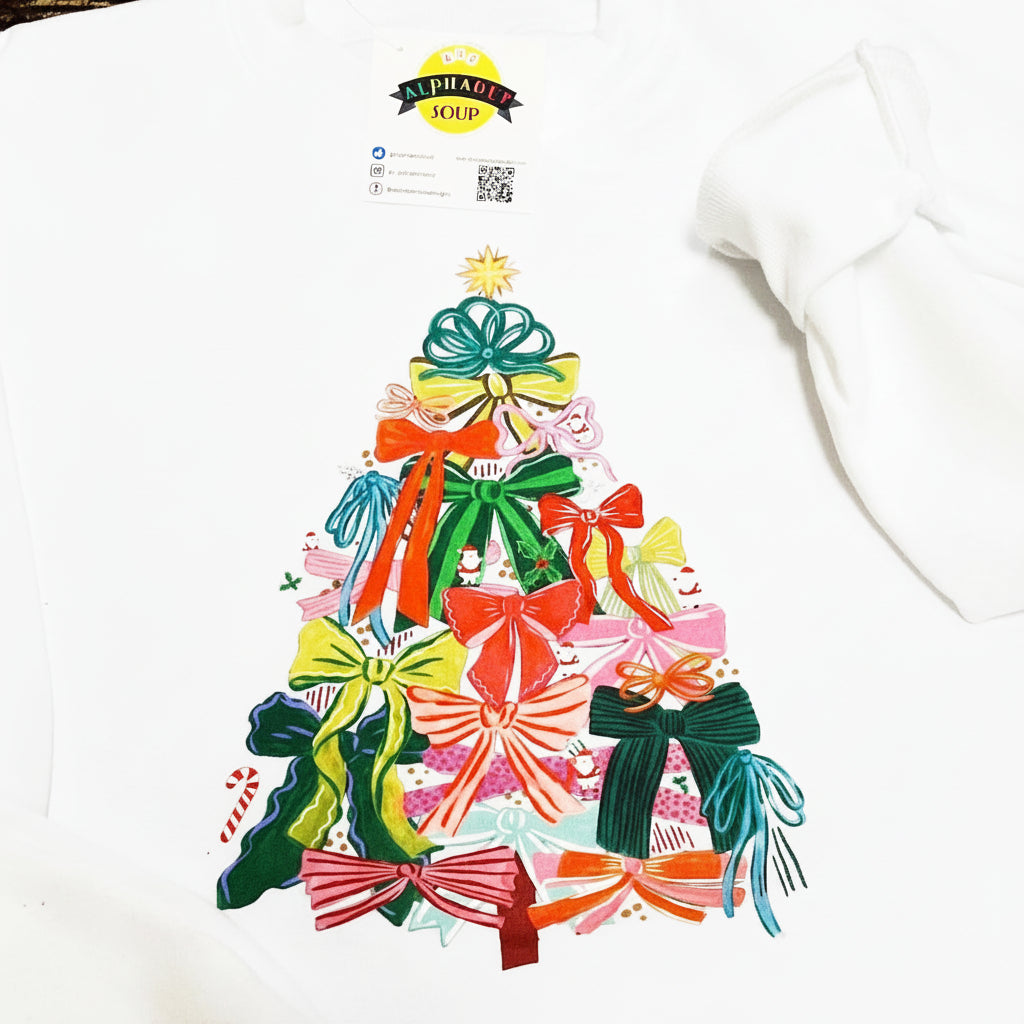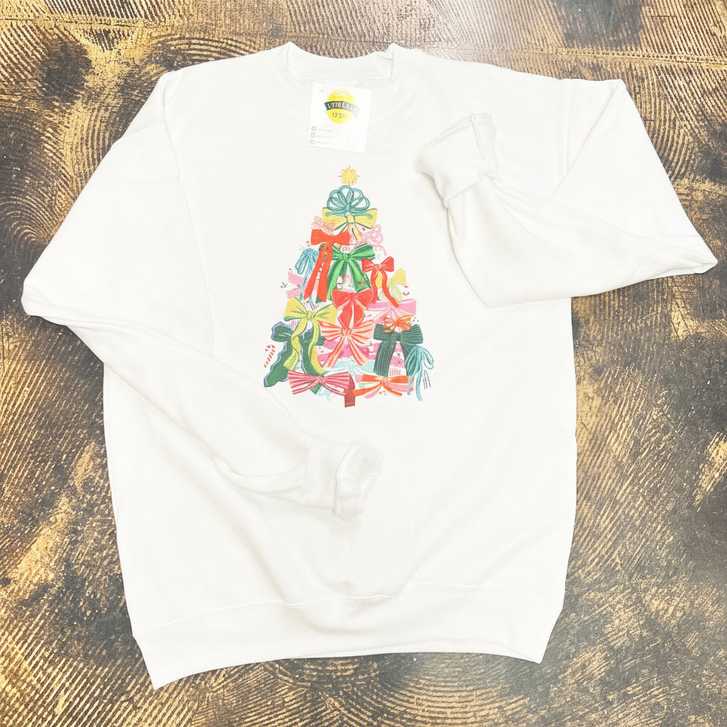 Regular price $38.00 Sale price $19.00 Save $19.00Be on trend with this coquette bow Christmas tree!!! This white crewneck with coquette bow Christmas trees is adorable!! Grab yours before they are gone!