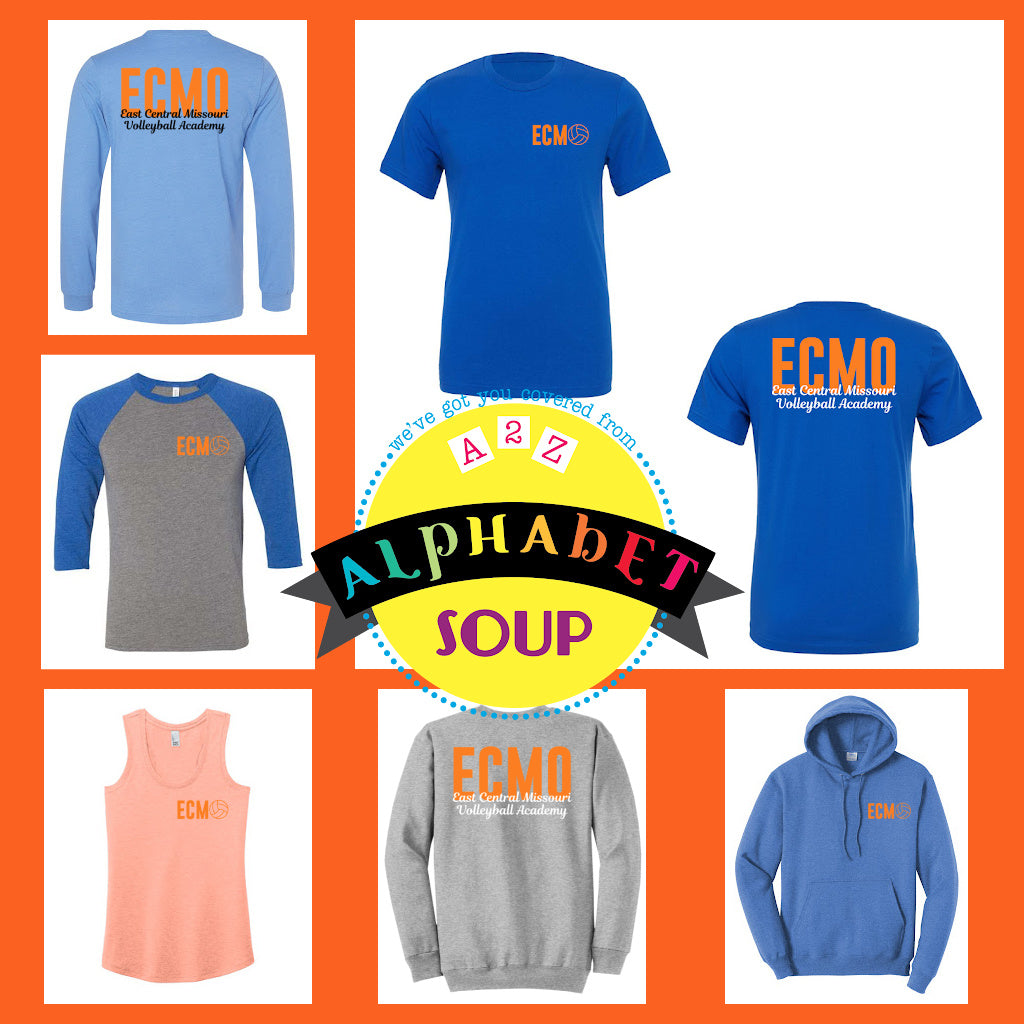 Alphabet Soup Designs has partnered with East Central Volleyball to bring you a selection of personalized Spirit Wear. The ECMO Retro design looks amazing on the adult and youth, Bella Canvas Tees and Raglans, District Tanks and Port & Co Sweatshirt styles.