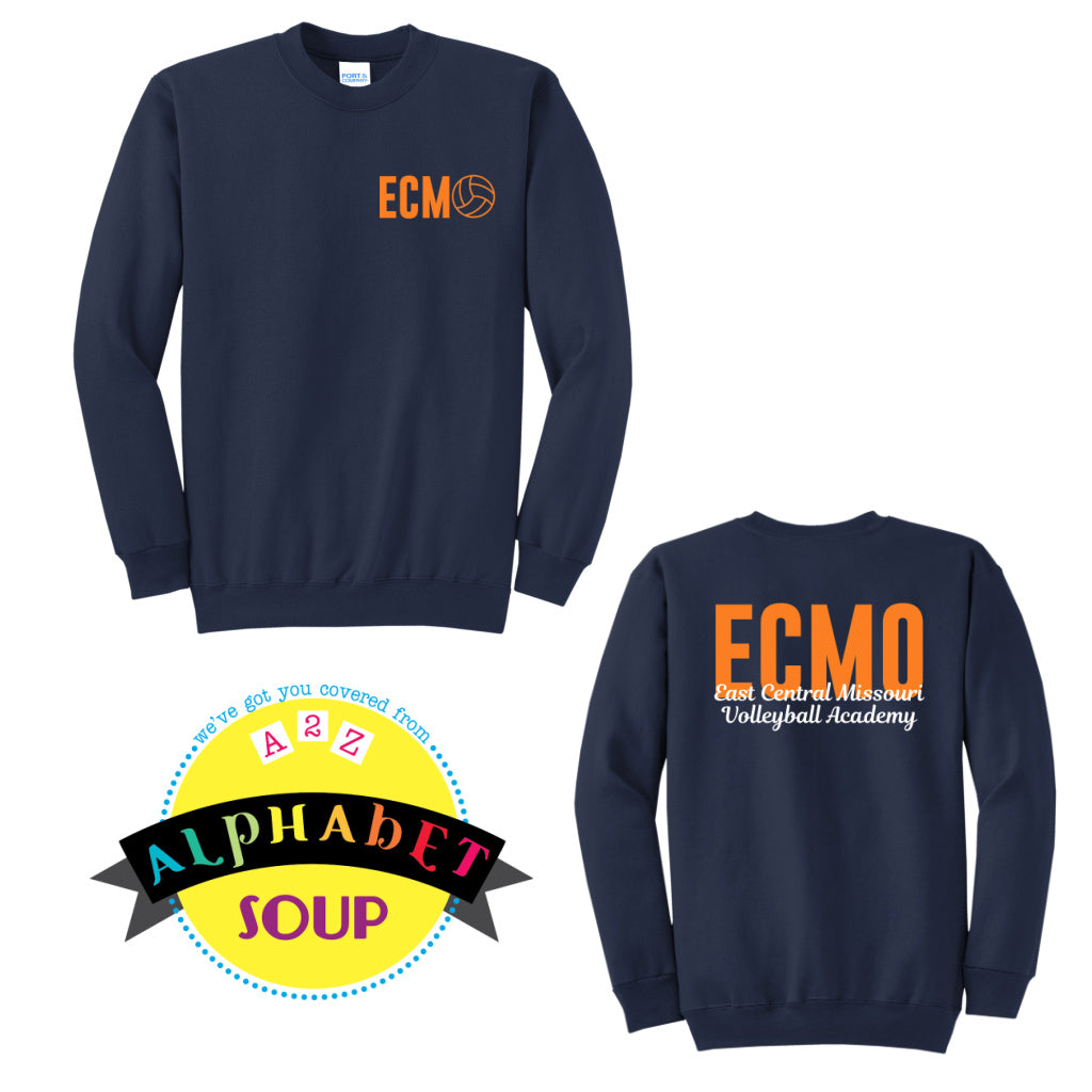 Navy blue sweatshirt with 'ECMO' and volleyball graphic on front, and 'ECMO East Central Missouri Volleyball Academy' text on back