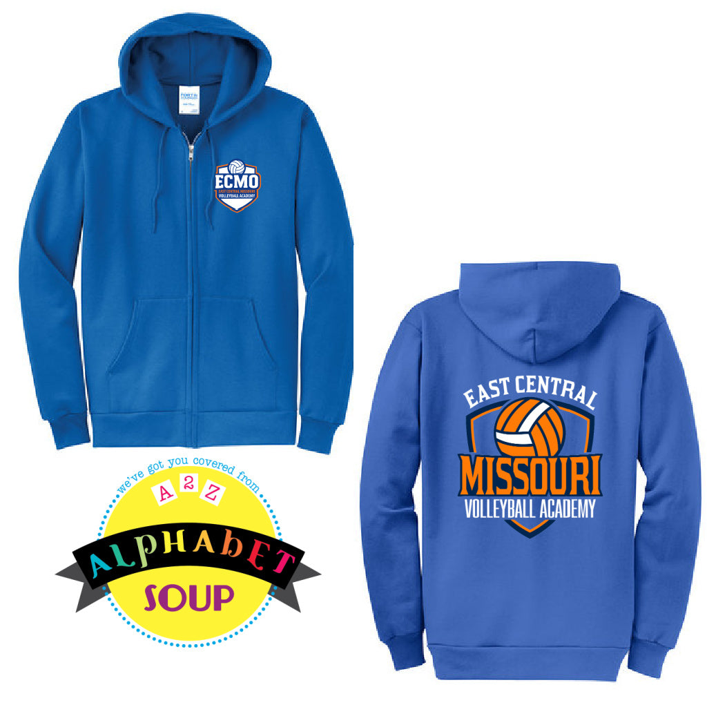 Blue hoodie with 'ECMO' logo on front and 'East Central Missouri Volleyball Academy'