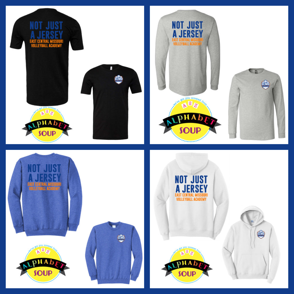 Alphabet Soup Designs has partnered with ECMO Volleyball to bring you a selection of personalized Team Spirit Wear. Support your favorite volleyball team by wearing the East Central Volleyball Not Just a Jersey design on T-shirts, long sleeve tees, crewneck sweatshirts and hoodies in Youth and Adult sizes!