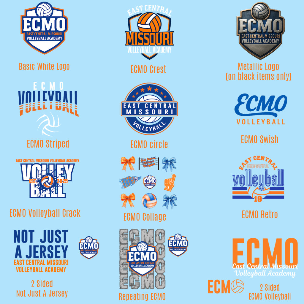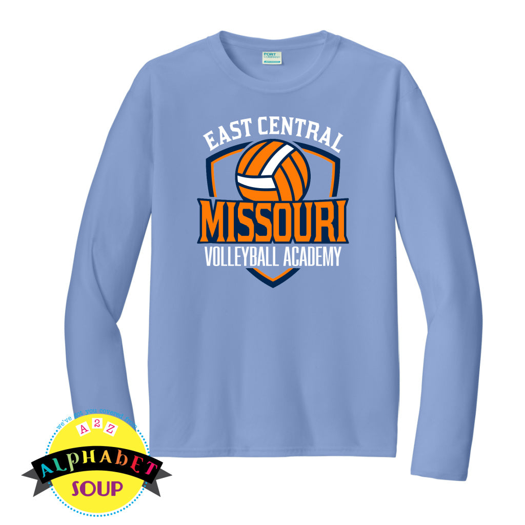 Light blue long-sleeve shirt with 'East Central Missouri Volleyball Academy' design