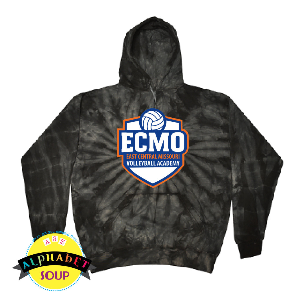 Black tie-dye hoodie with ECMO East Central Missouri Volleyball Academy logo