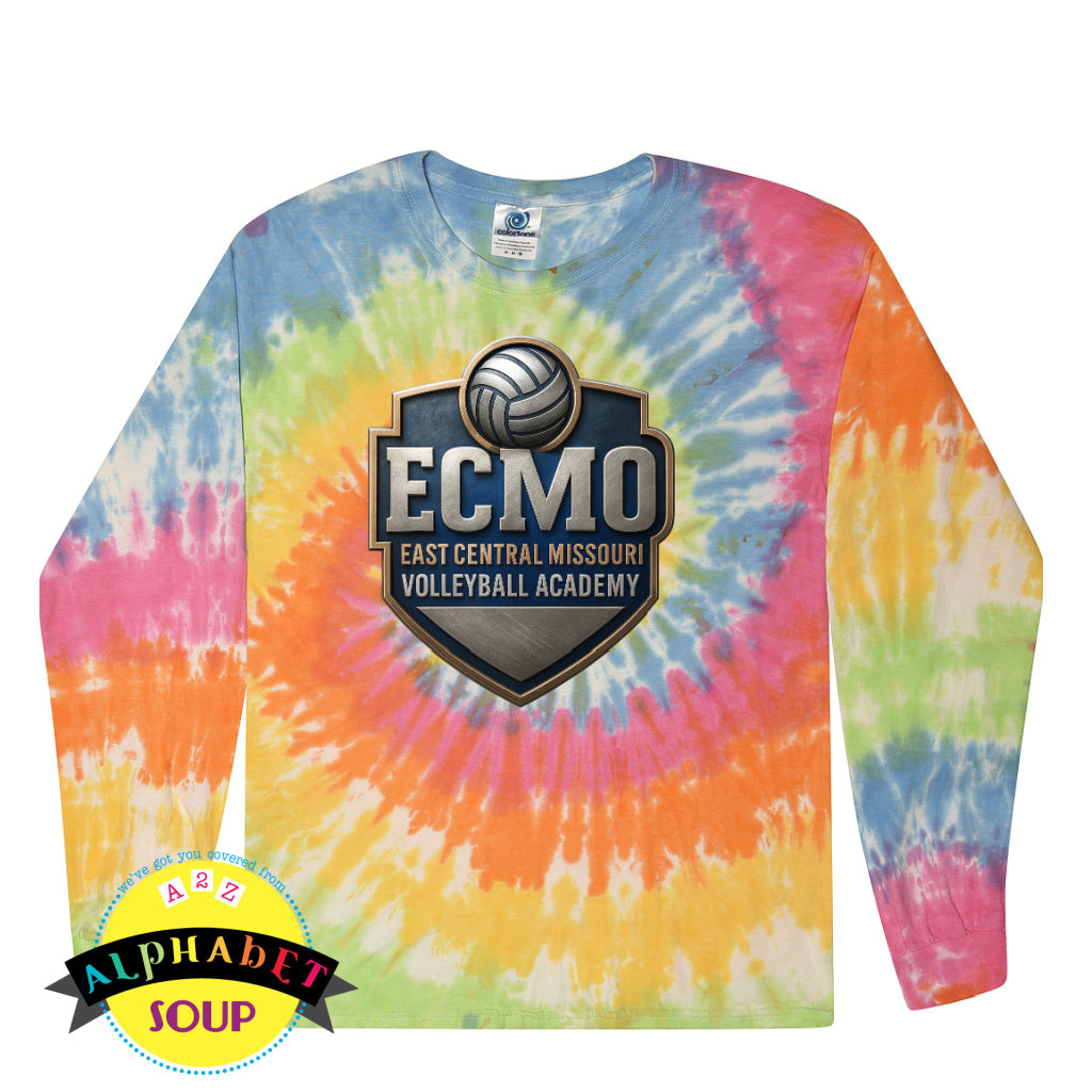 Tie-dye long-sleeve shirt with East Central Missouri Volleyball Academy logo