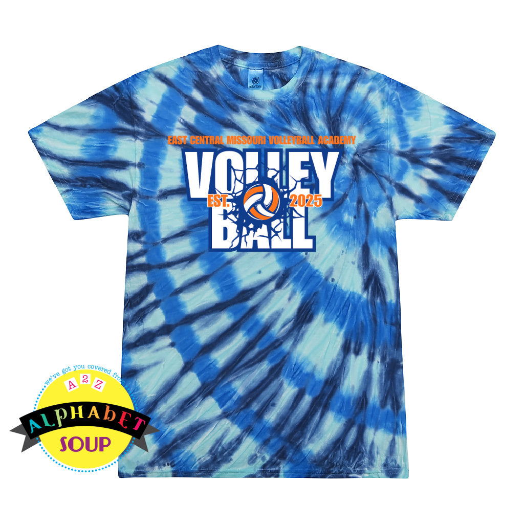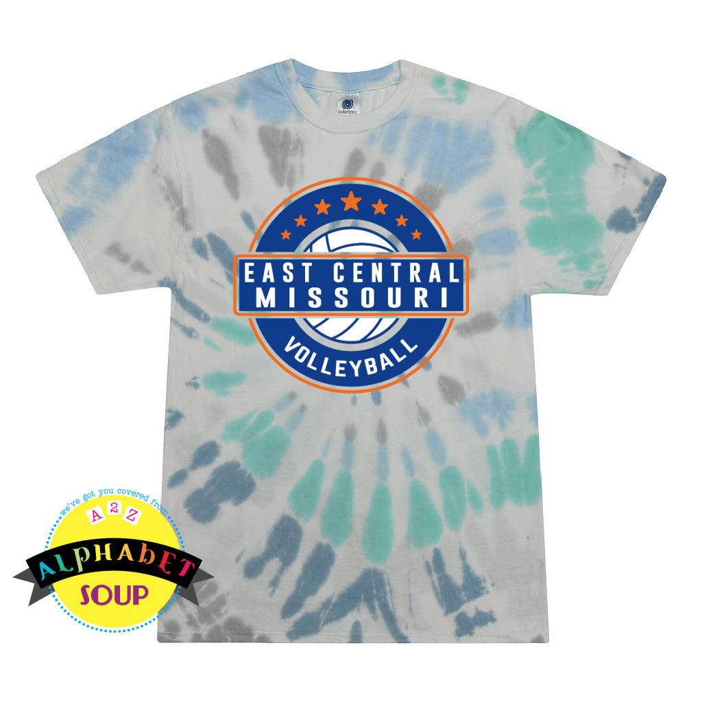 Tie-dye t-shirt with 'East Central Missouri Volleyball' logo