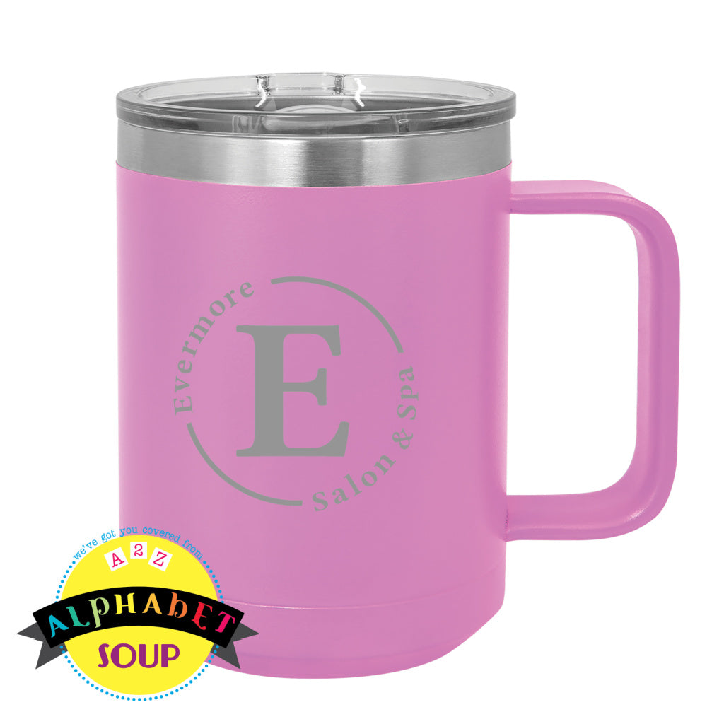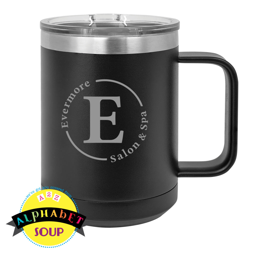 Alphabet Soup Designs has partnered with Evermore Salon And Spa to bring you a selection of personalized apparel. This 15oz Stainless Coffee Mug is laser etched for long-lasting design. Holds 2x the heat and cold resistant compared to other tumblers.
