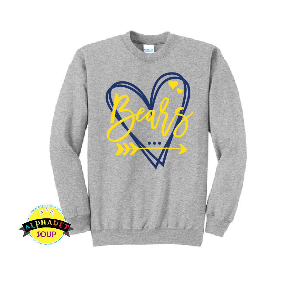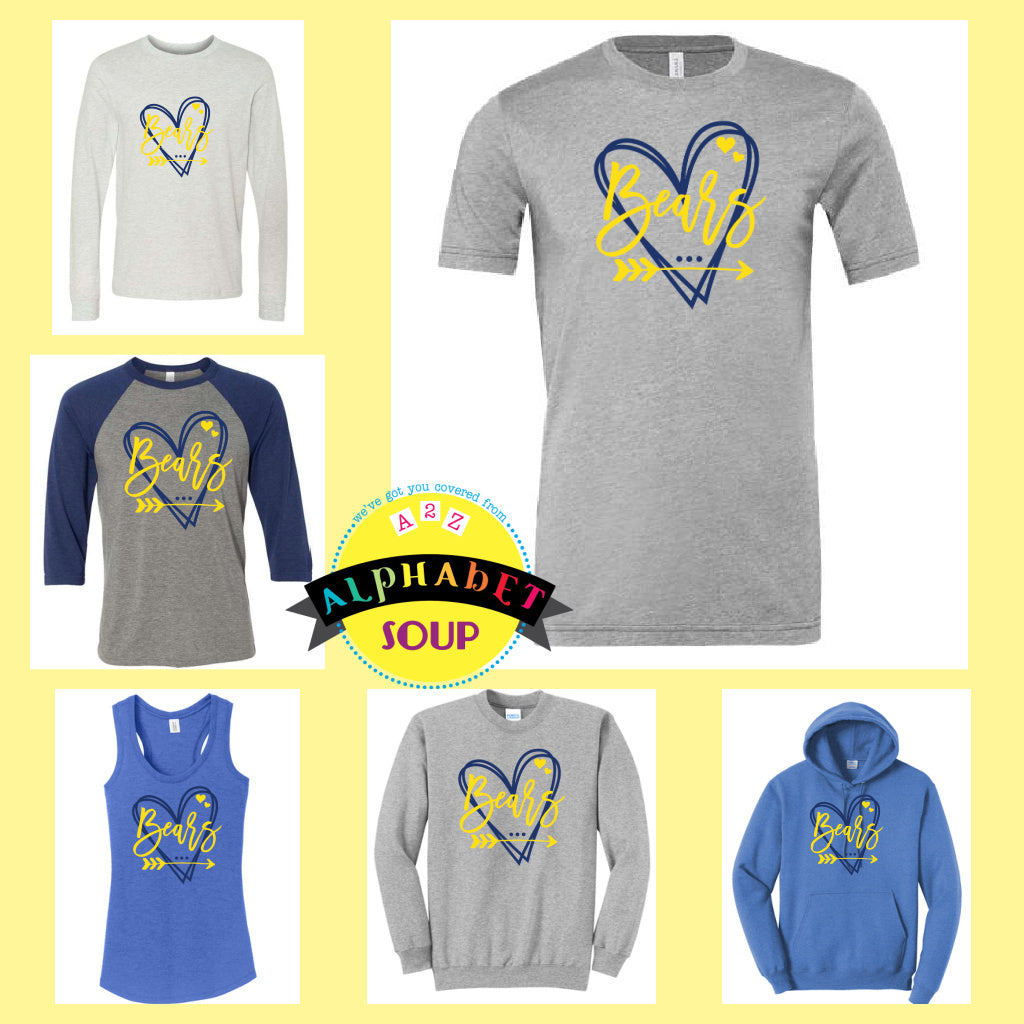 Alphabet Soup Designs has partnered with Heritage Elementary to bring you a selection of personalized School Spirit Wear. The Heritage Elementary Bears Heart design looks amazing on the adult and youth, Bella Canvas Tees and Raglans, District Tanks and Port & Co Sweatshirt styles.