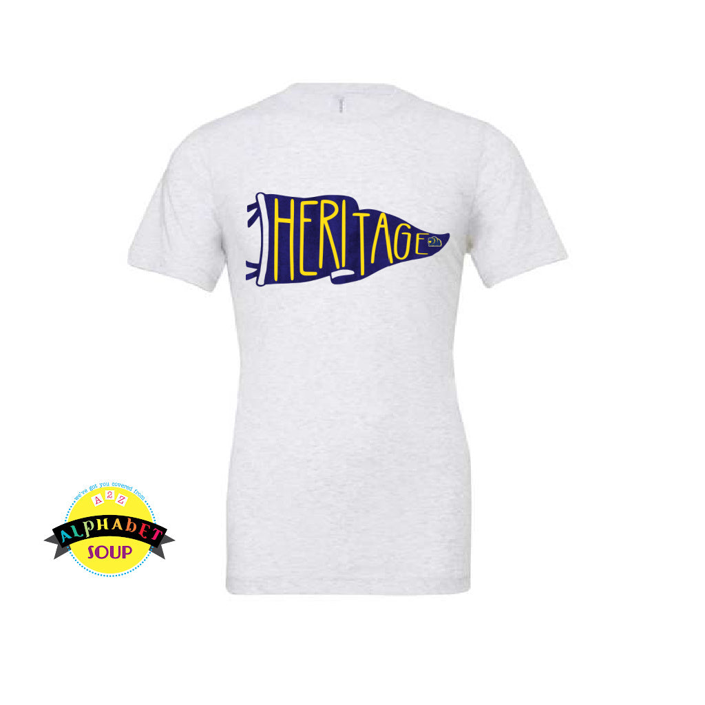 Alphabet Soup Designs has partnered with Heritage Elementary to bring you a selection of personalized School Spirit Wear. The Heritage Elementary Pennant design looks amazing on the adult and youth, Bella Canvas Tees and Raglans, District Tanks and Port & Co Sweatshirt styles.