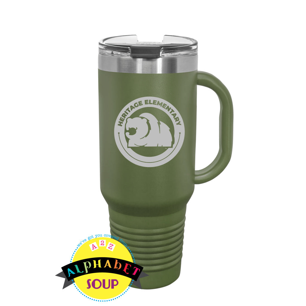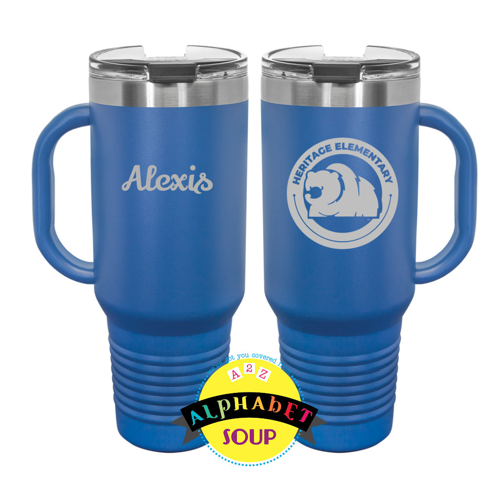 Alphabet Soup Designs has partnered with Heritage Elementary to bring you a selection of personalized Team Spirit Wear. These Stainless Travel Mug with a handle are laser etched for long lasting design. There are 2 sizes of Travel Mugs 20oz & 40oz, each comes with a lid and a straw.
