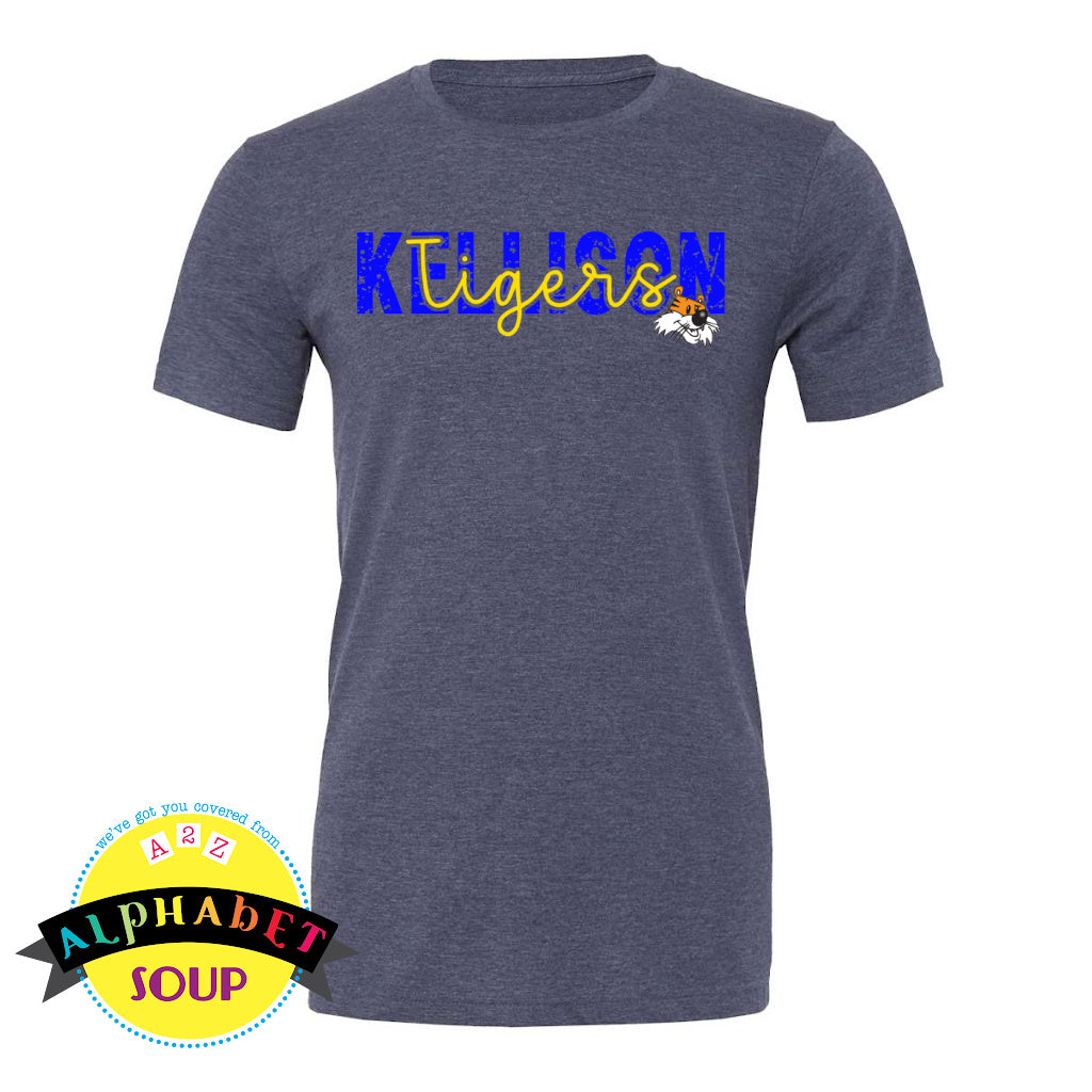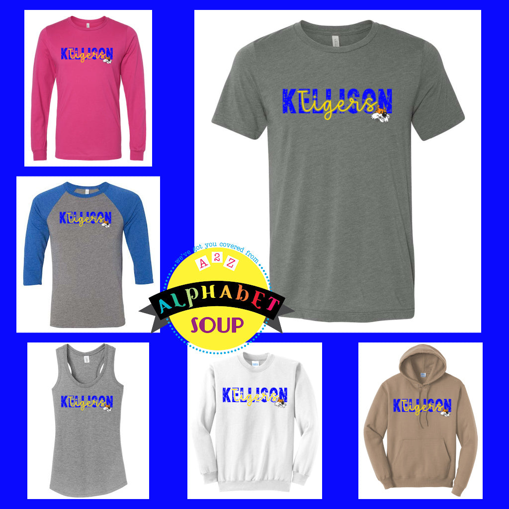 Alphabet Soup Designs has partnered with Kellison Elementary to bring you a selection of personalized School Spirit Wear. The Kellison Elementary Distressed Kellison design looks amazing on the adult and youth, Bella Canvas Tees and Raglans, District Tanks and Port & Co Sweatshirt styles.