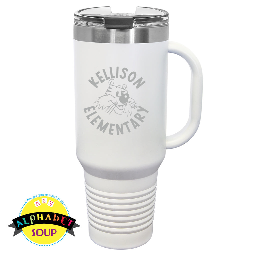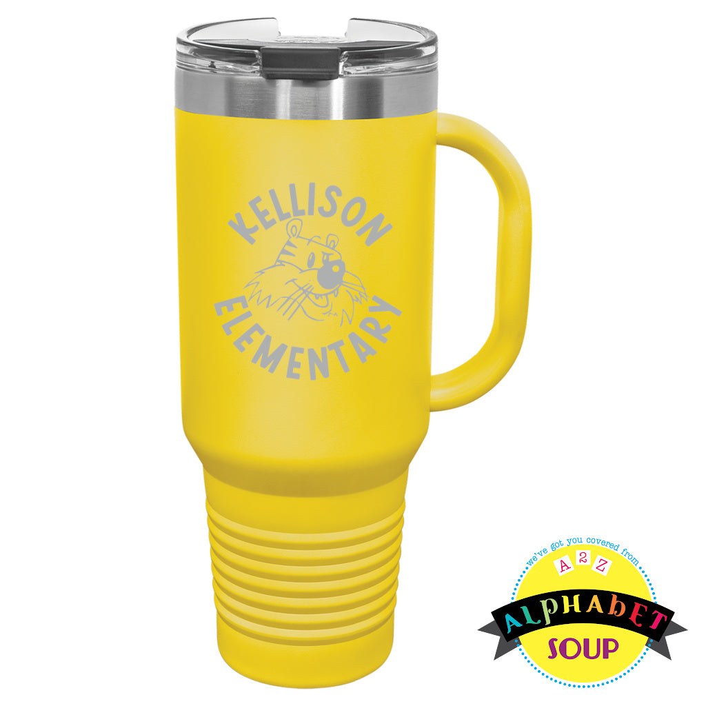Alphabet Soup Designs has partnered with Kellison Elementary to bring you a selection of personalized School Spirit Wear. These Stainless steel Travel mugs with a handle are laser etched for long-lasting design. There are 2 sizes of Travel Mugs: 20oz & 40oz, each comes with a lid and a straw.