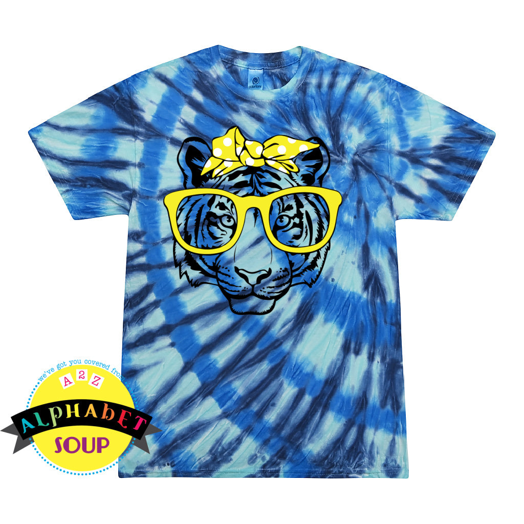 Yellow tie-dye t-shirt with 'TIGERS' in distressed blue text.