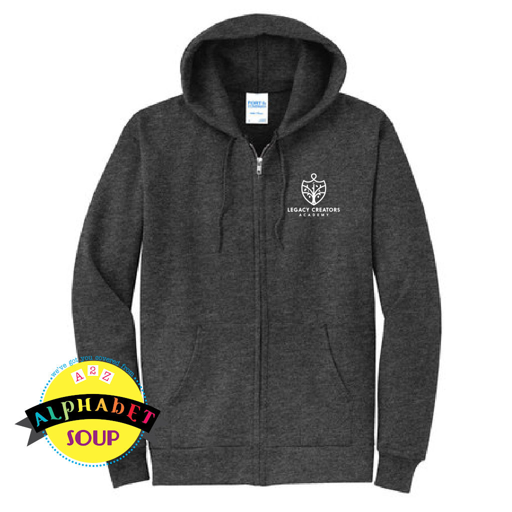 Alphabet Soup Designs has partnered with Legacy Creators Academy to bring you a selection of personalized Spirit Wear. Port & Co cozy sweats in their core weight are super comfy. This Full Zip Hoodie is your go to before heading out the door!  It is the perfect item for layering on the those days when the weather can't make up its' mind.