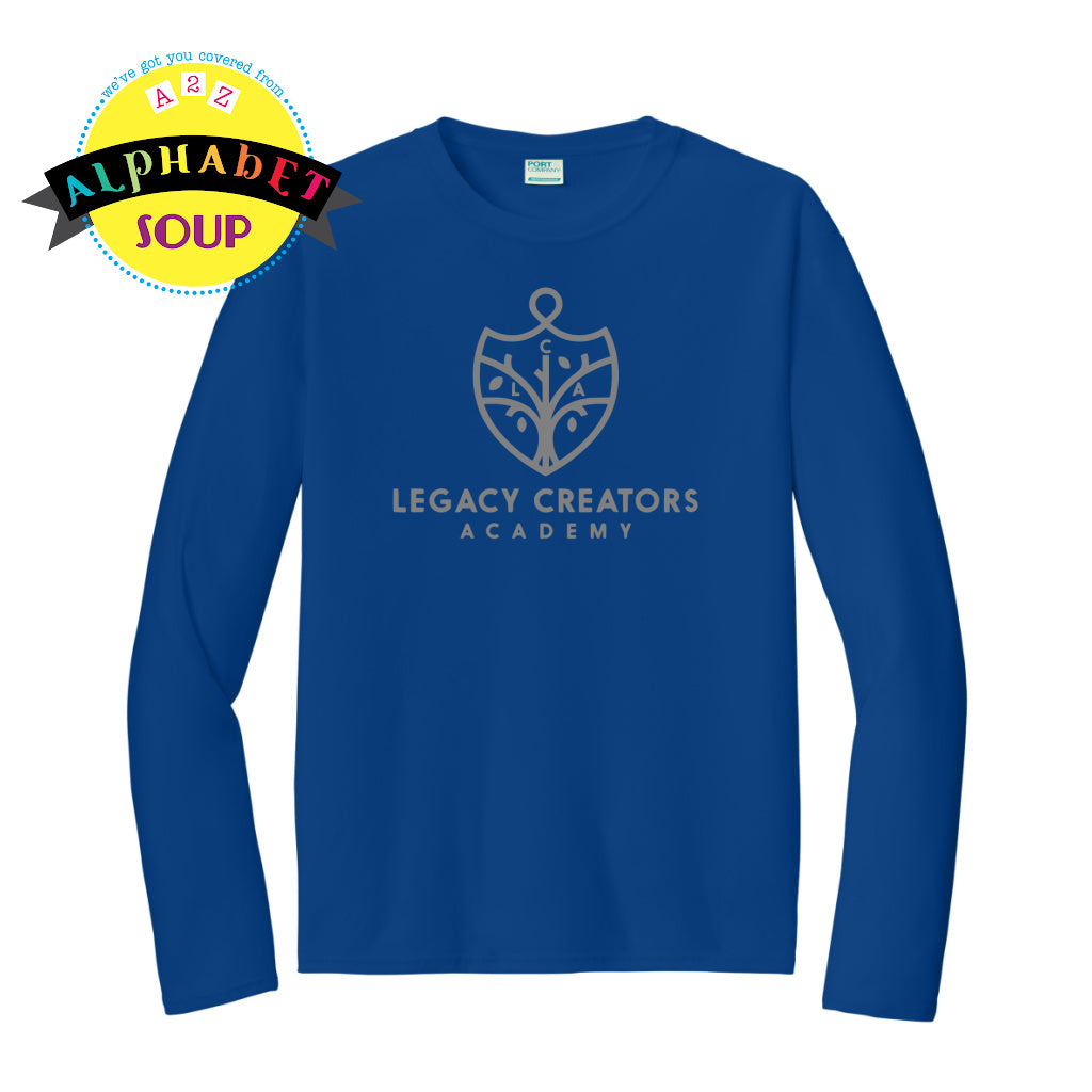 Alphabet Soup Designs has partnered with Legacy Creators Academy to bring you a selection of personalized Spirit Wear. The Port and Co Performance Long Sleeve Tee is rated UPF50 to help combat harmful UV rays, this tee also performs with Dry Zone ® moisture-wicking technology to keep you cool, dry and comfortable. It is a stylish way to show your school spirit with the Legacy Creators Academy logo.