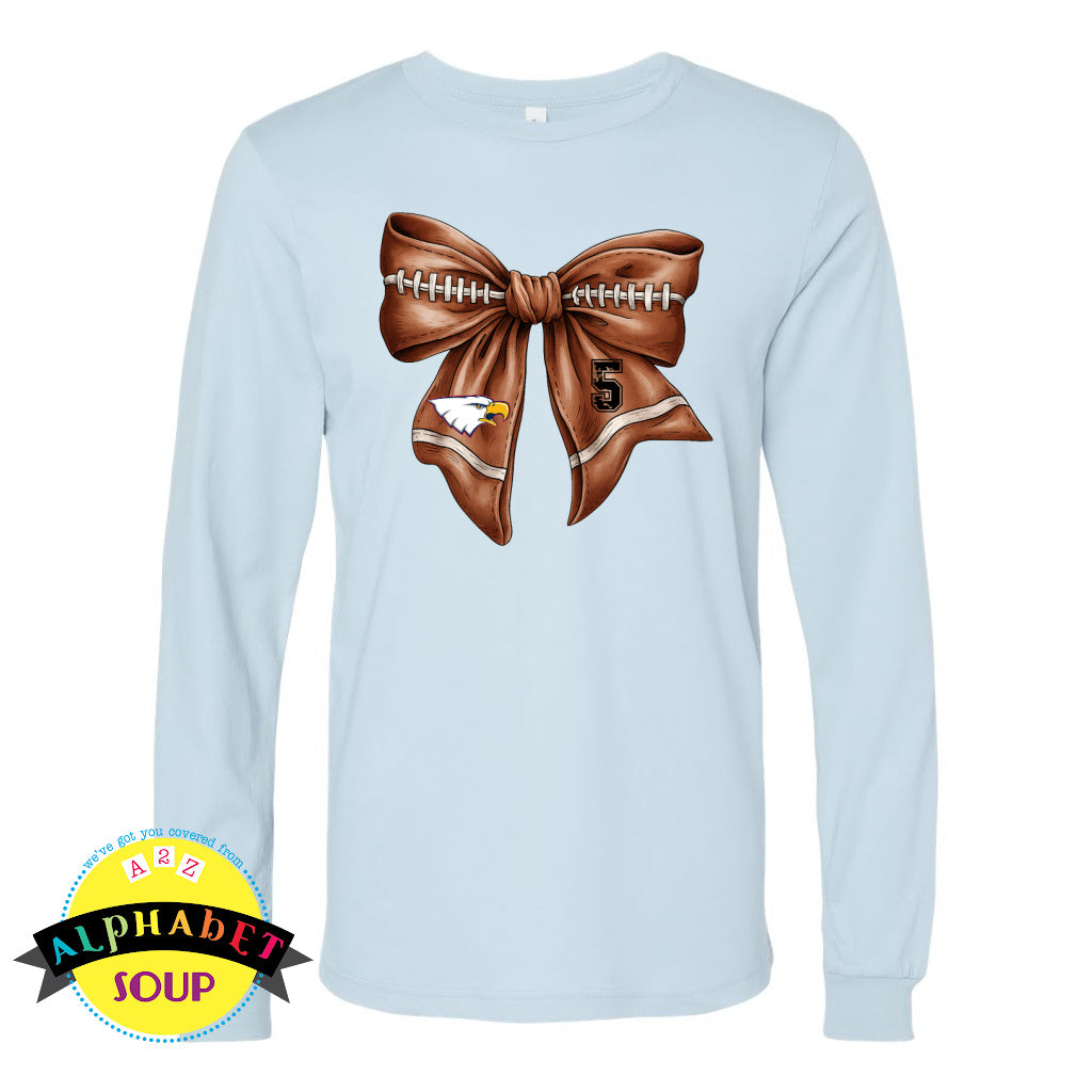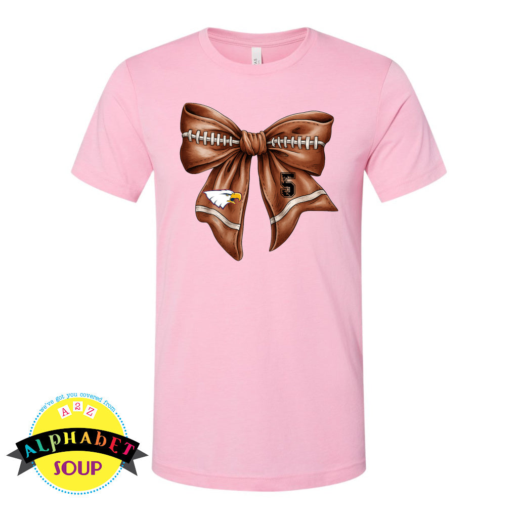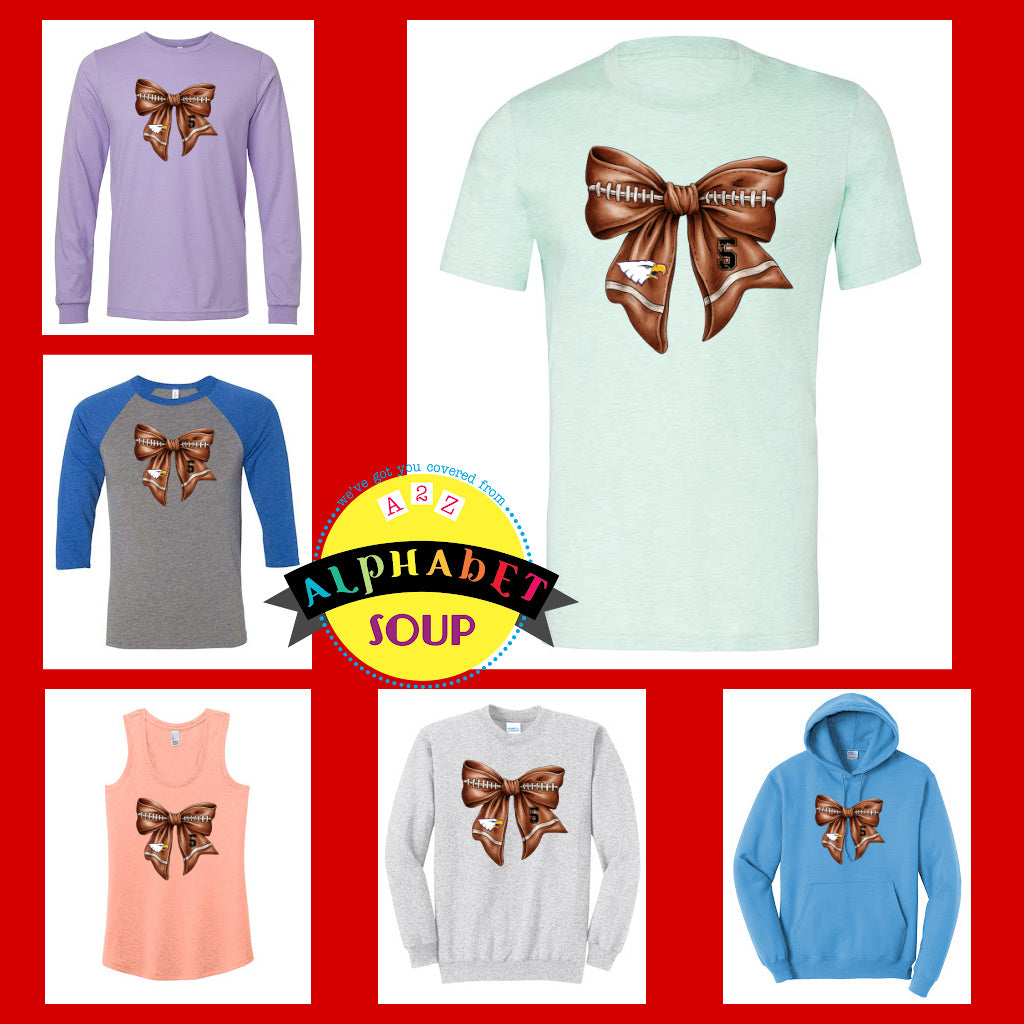 Alphabet Soup Designs has partnered with Jr Eagles to bring you a selection of personalized Team Spirit Wear. The Jr Eagles Big Football Bow design looks amazing on the adult and youth, Bella Canvas Tees and Raglans, District Tanks and Port & Co Sweatshirt styles.