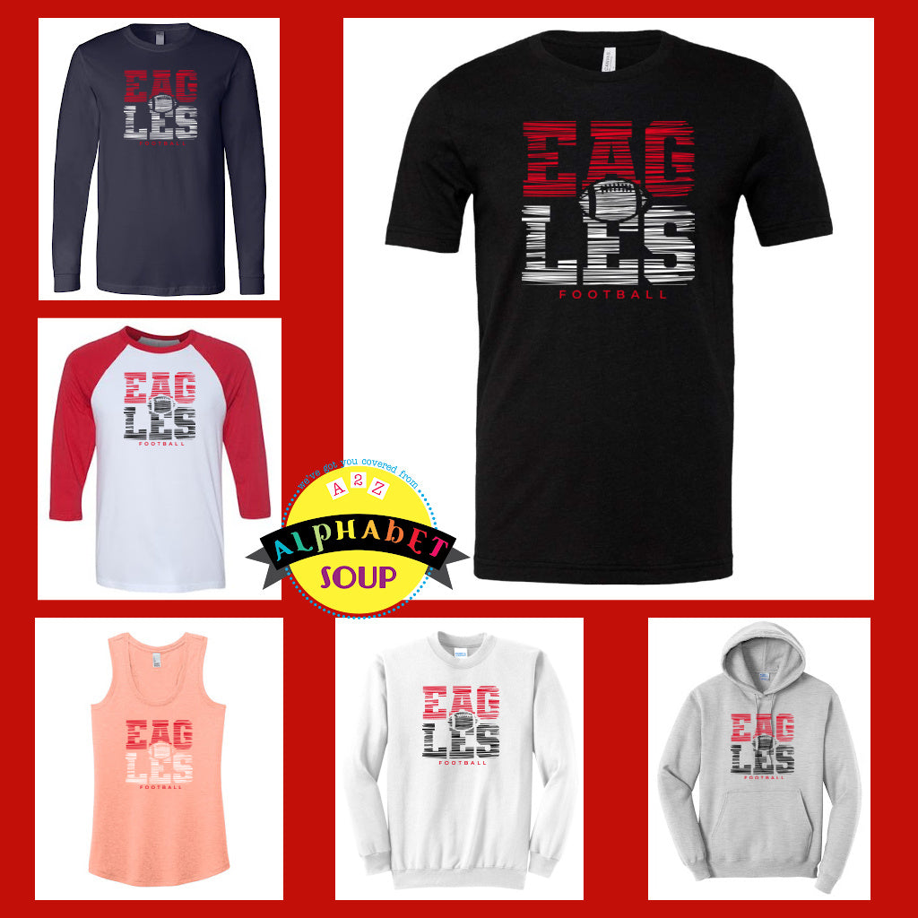 Alphabet Soup Designs has partnered with Jr Eagles to bring you a selection of personalized Team Spirit Wear. The Jr Eagles Scribble Design looks amazing on the adult and youth, Bella Canvas Tees and Raglans, District Tanks and Port & Co Sweatshirt styles.