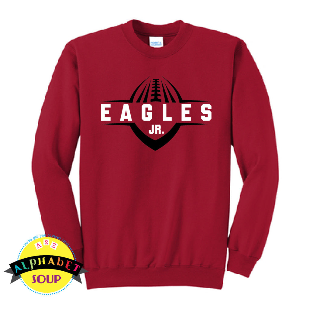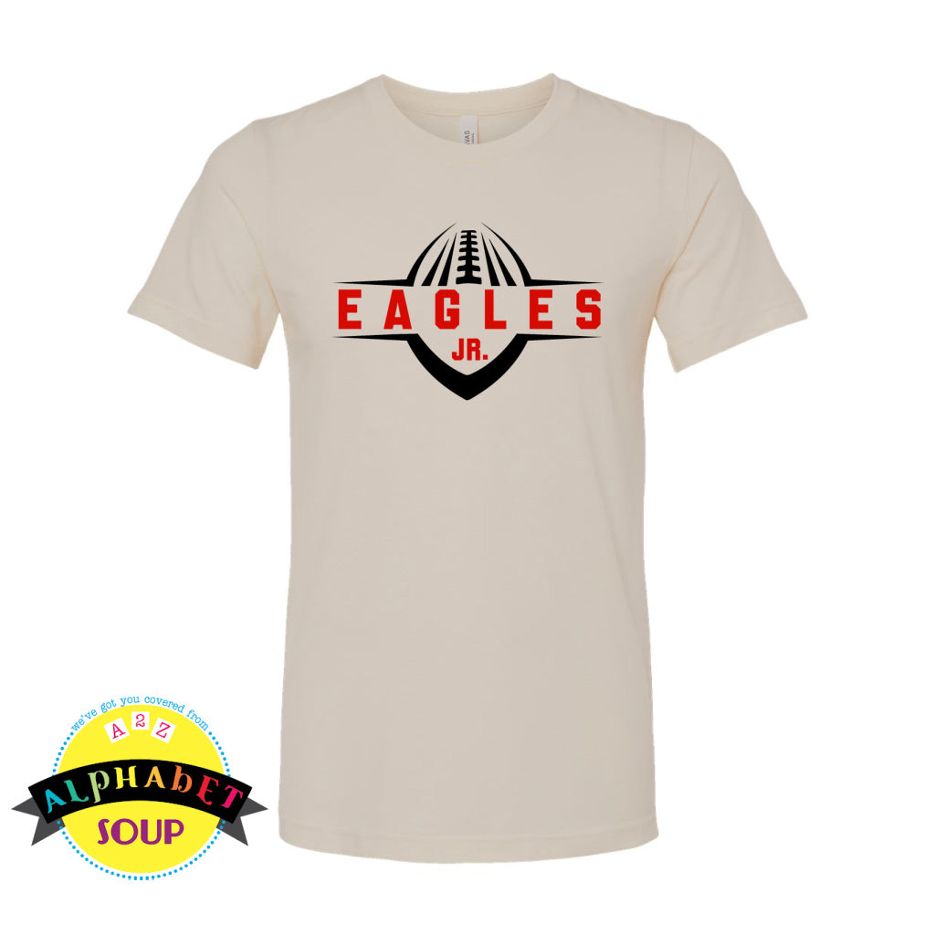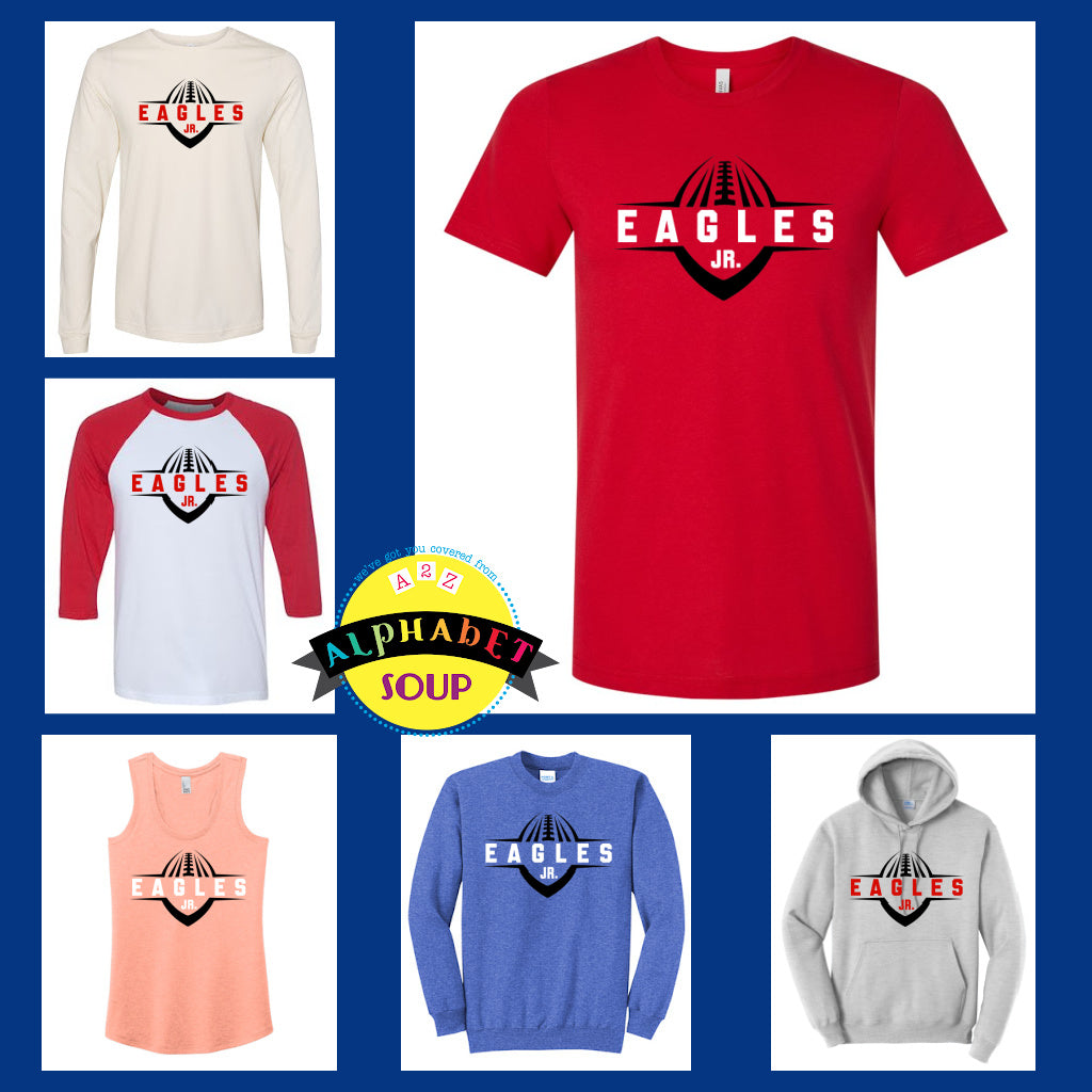 Alphabet Soup Designs has partnered with Jr Eagles to bring you a selection of personalized Team Spirit Wear. The Jr Eagles Vertical Football design looks amazing on the adult and youth, Bella Canvas Tees and Raglans, District Tanks and Port & Co Sweatshirt styles.