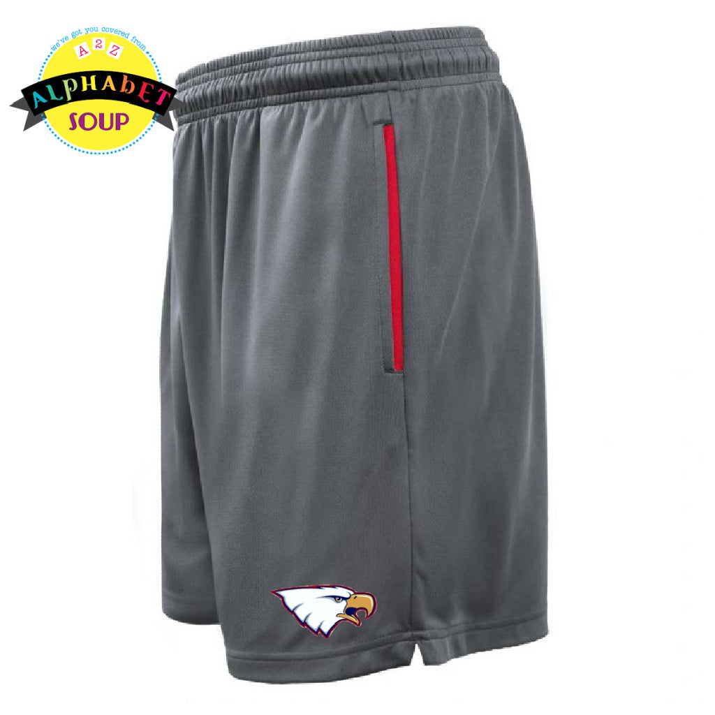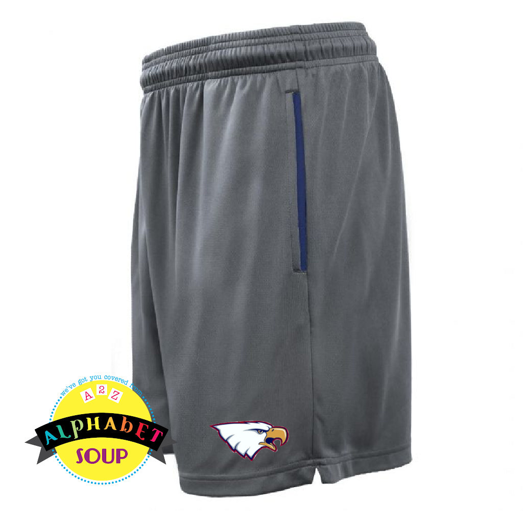 Liberty High School eagle logo on driveline shorts with navy pockets