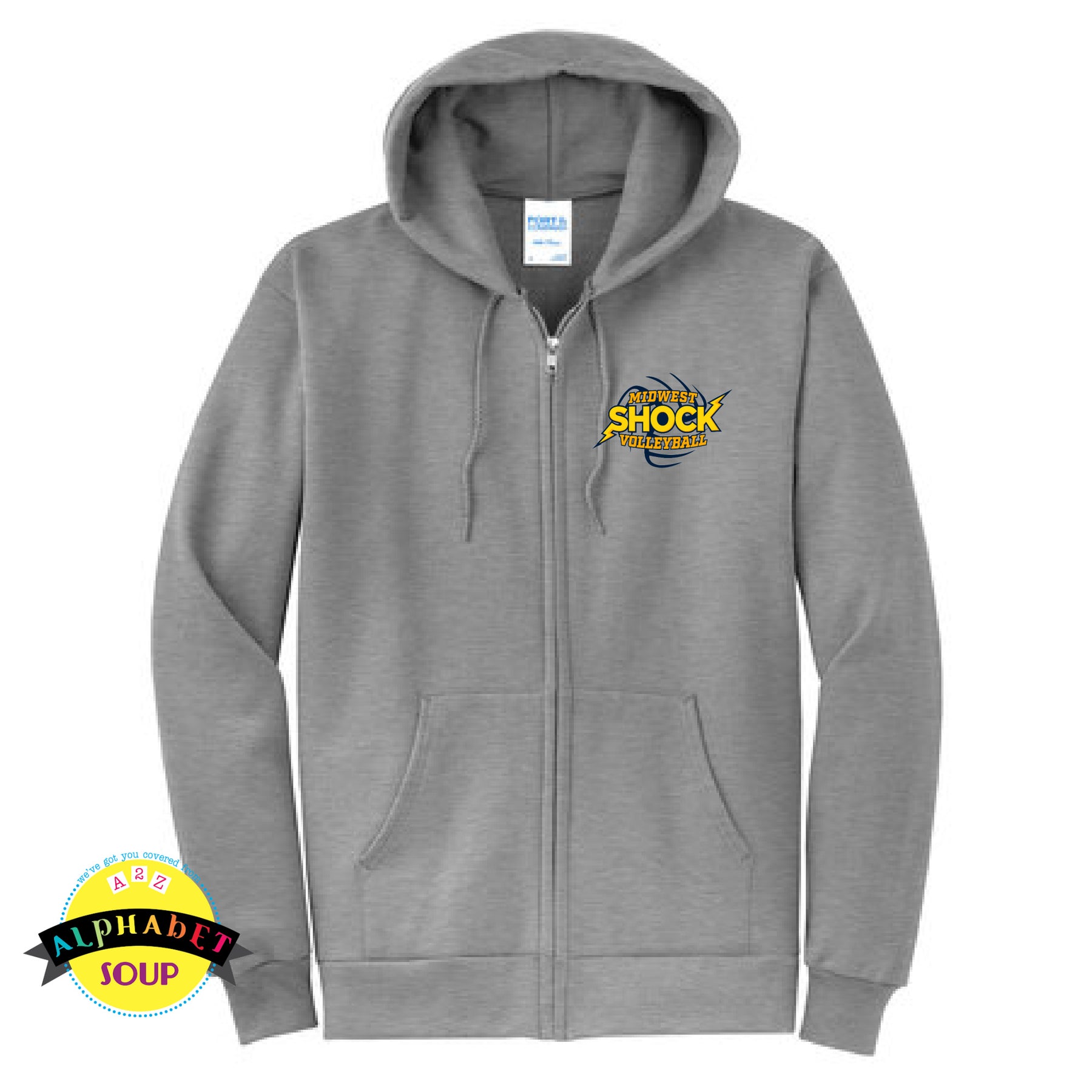 Alphabet Soup Designs has partnered with Midwest Shock to bring you a selection of personalized Spirit Wear. Port & Co cozy sweats in their core weight are super comfy. This Full Zip Hoodie is your go to before heading out the door! It is the perfect item for layering on the those days when the weather can't make up its' mind.