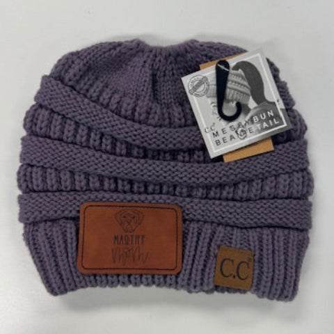 CC Beanie- Violet Messy Bun Beanie "Mastiff Mom" Leather Patch