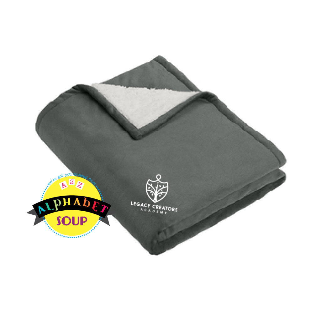 Grey blanket with sherpa lining featuring 'Legacy Creators Academy' embroidered logo.