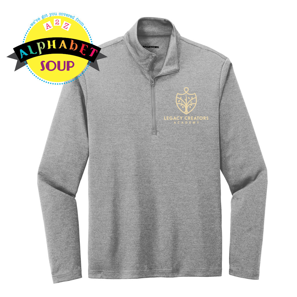 Alphabet Soup Designs has partnered with Legacy Creators Academy to bring you a selection of personalized Spirit Wear. This stylish Sport Tek Endeavor 1/2 zip comes with Legacy Creators Academy vinyl Logo.  Each 1/2 Zip pullover is made with a subtle heather texture and moisture-wicking technology. This lightweight 1/2-zip will help you achieve all your performance endeavors.